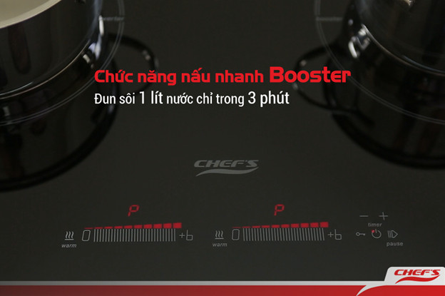- Chức năng Booster ("B"): Các mẫu bếp từ cao cấp hiện nay đều được tích hợp chức năng nấu nhanh. Cho phép người dùng có thể tăng công suất bếp lên gấp rưỡi so với thông số kỹ thuật ban đầu. Nếu bạn muốn sử dụng tính năng này thì nhận vào ký hiệu “Booster” nhé.