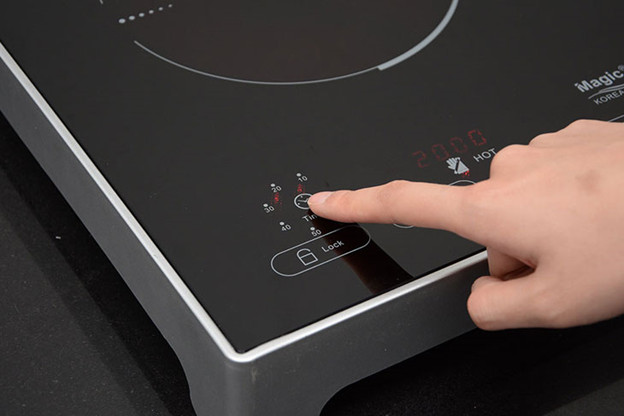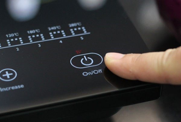 - Khởi động bếp từ (On/ Off): Để bếp bắt đầu hoạt động, trước tiên chúng ta phải khởi động bếp từ. Nút khởi động bếp từ thường được thiết kế ngay một bên góc bếp có ký tự On/Off. Sau khi nhấn nút này khoảng 10s bếp, hệ thống bảng điều khiển bắt đầu phát sáng và bạn đã có thể bắt đầu nấu nướng.