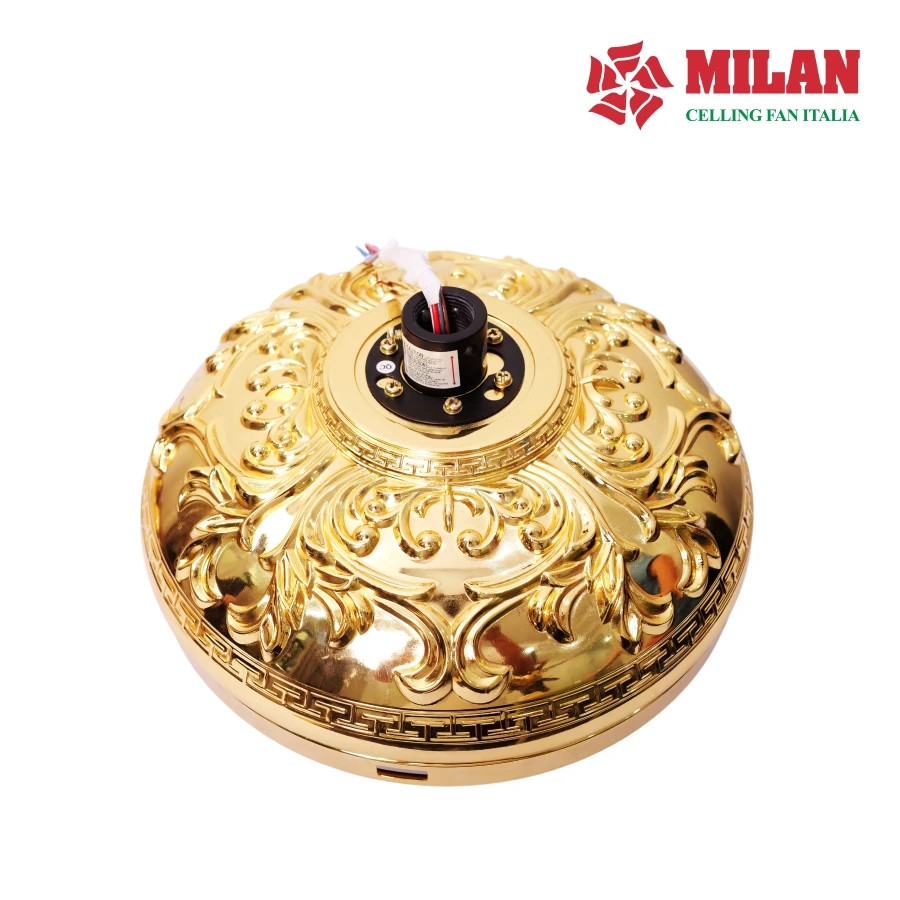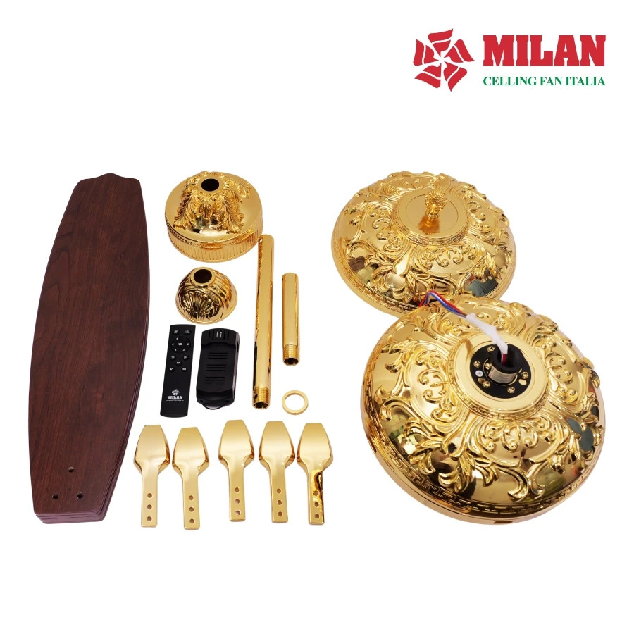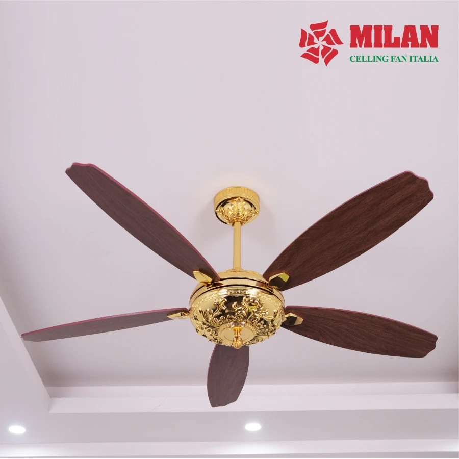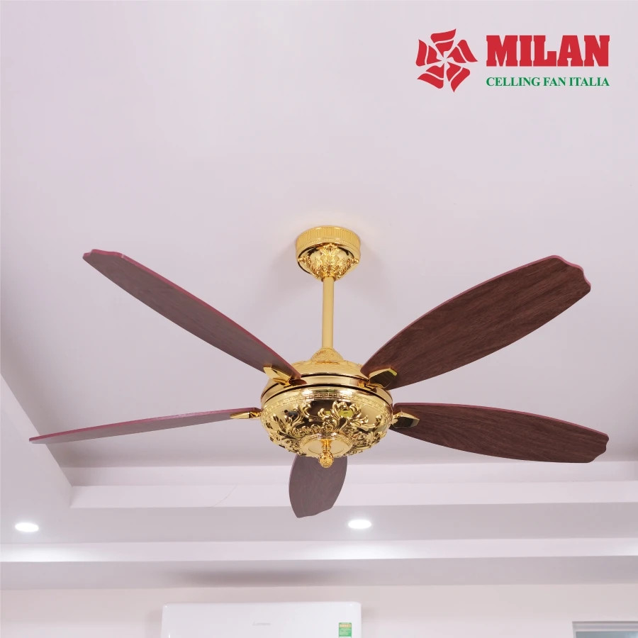 Quạt trần 5 cánh không đèn FY966 KĐ - MẠ VÀNG 9999 có nhãn hiệu MILAN thuộc thương hiệu Quạt Trần ITALIA Quạt thiết kế với 5 cánh làm bằng gỗ Plywood cao cấp, thân quạt làm bằng đồng nguyên chất, mạ vàng 9999 được đúc khắc hoa văn chi tiết mang đến cho không gian nội thất sang trọng, đẳng cấp, nói lên được vị thế của gia chủ.