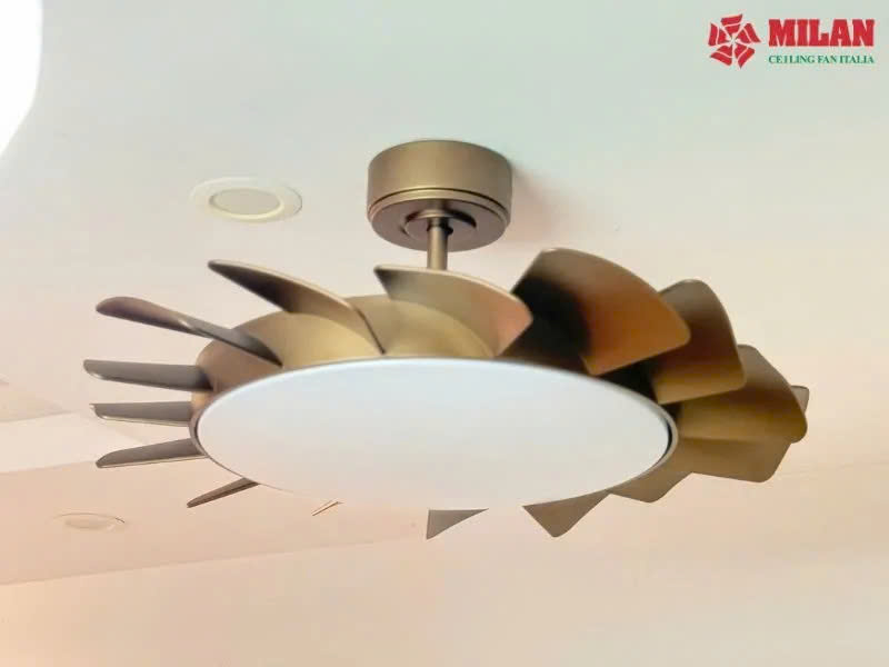 Quạt trần có đèn FY566 Màu đồng cát toát lên phong cách hiện đại, tinh tế như một tác phẩm nghệ thuật ngay trên trần nhà. Cánh quạt uốn cong mềm mại, xếp lớp tựa những bông hoa bung nở, mang đến cảm giác nhẹ nhàng và thanh lịch.