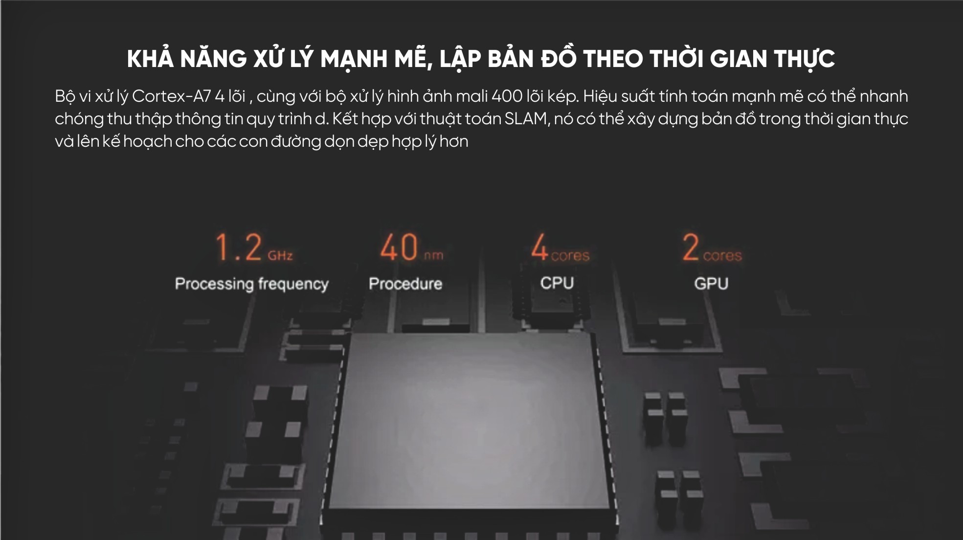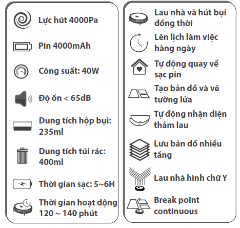Khả năng hút bụi với lực hút tối đa 3500pa đảm bảo rằng robot có thể loại bỏ các hạt bụi và bẩn một cách nhanh chóng và hiệu quả. Pin Li-ion dung lượng 4000mAh và thời gian hoạt động lên đến 120 phút cho phép robot làm sạch một diện tích phù hợp lên đến 150m2.