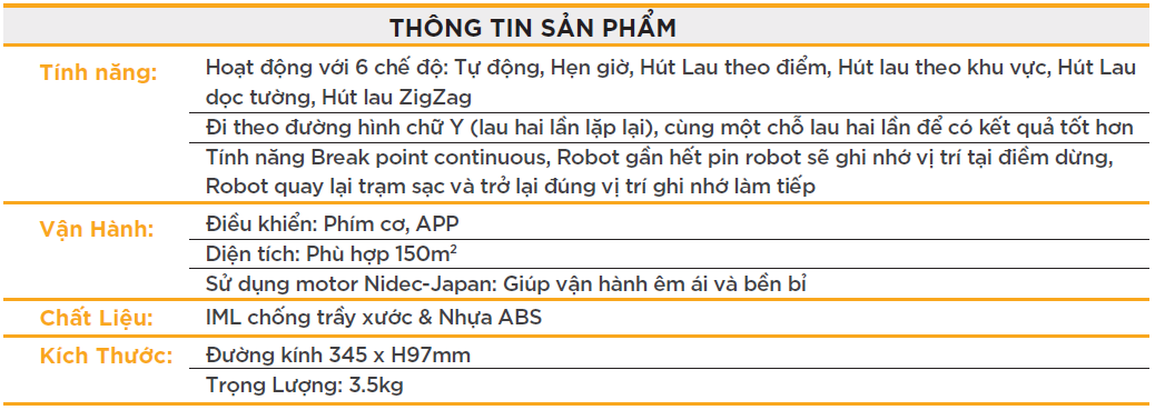 Với diện tích làm sạch phù hợp lên đến 150m2, robot này có khả năng làm sạch các khu vực rộng lớn trong ngôi nhà của bạn một cách hiệu quả. Motor Nidec-Japan đảm bảo hoạt động êm ái và đáng tin cậy, mang lại trải nghiệm làm sạch tốt nhất cho gia đình của bạn.