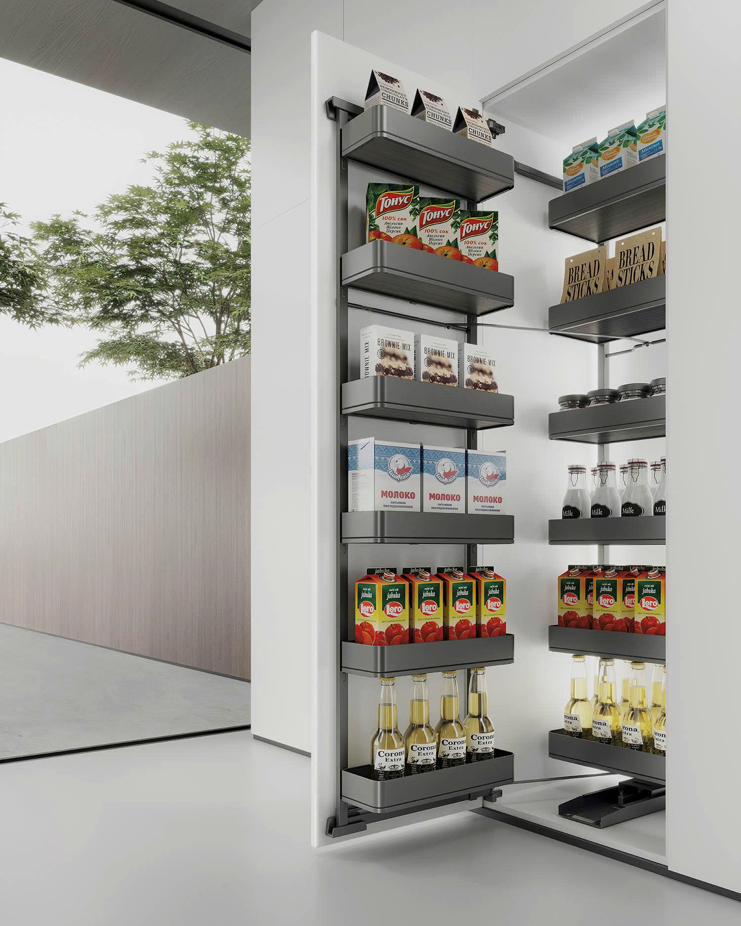 Thiết kế phần rổ đựng dạng hộp góp phần tạo cảm giác nhẹ nhàng, thanh thoát cho tủ kho. Với thiết kế 6 tầng, 12 rổ đựng được thu gọn trong khoang tủ góp phần tăng tính thẩm mĩ, tạo sự gọn gàng cho căn bếp nhà bạn.