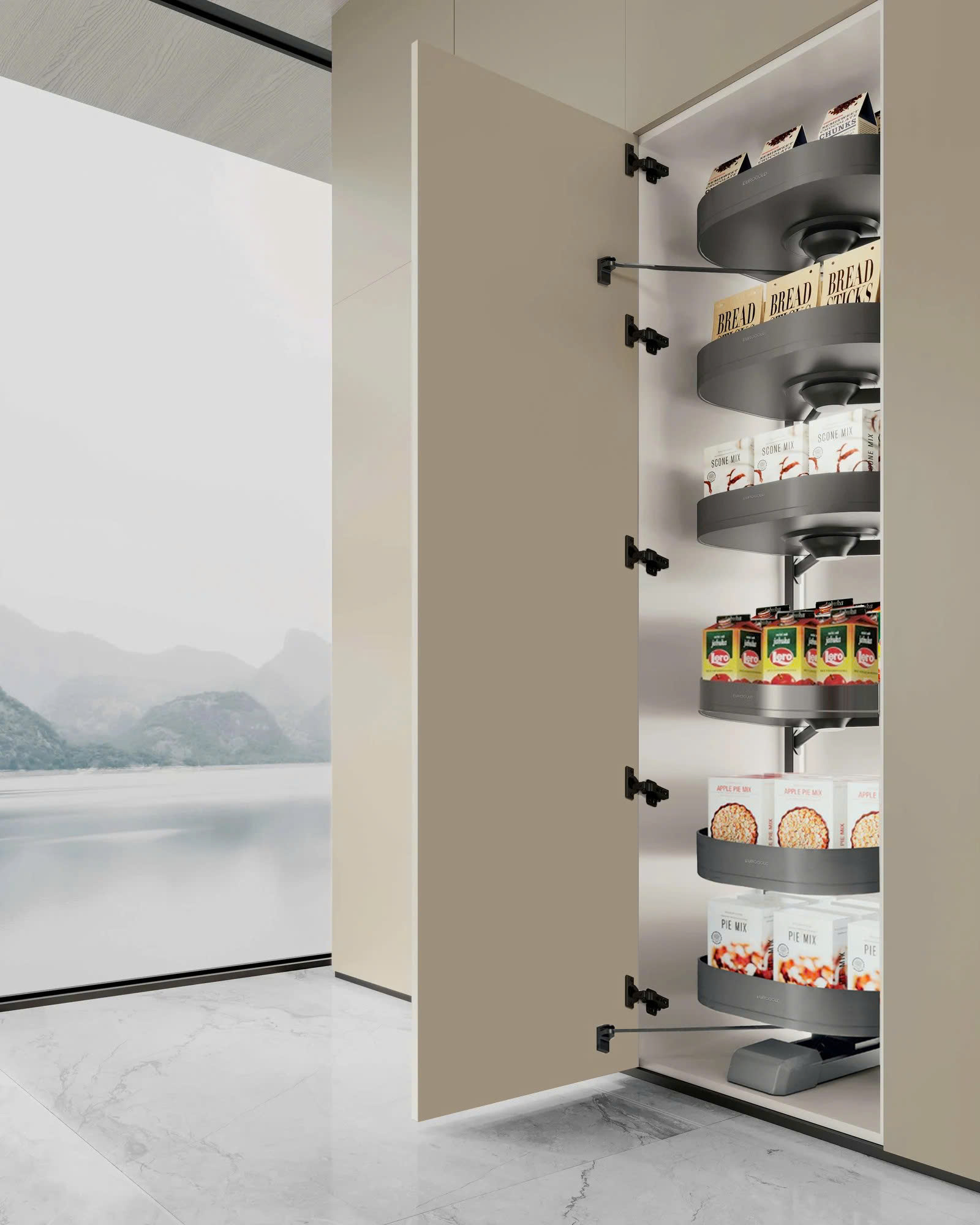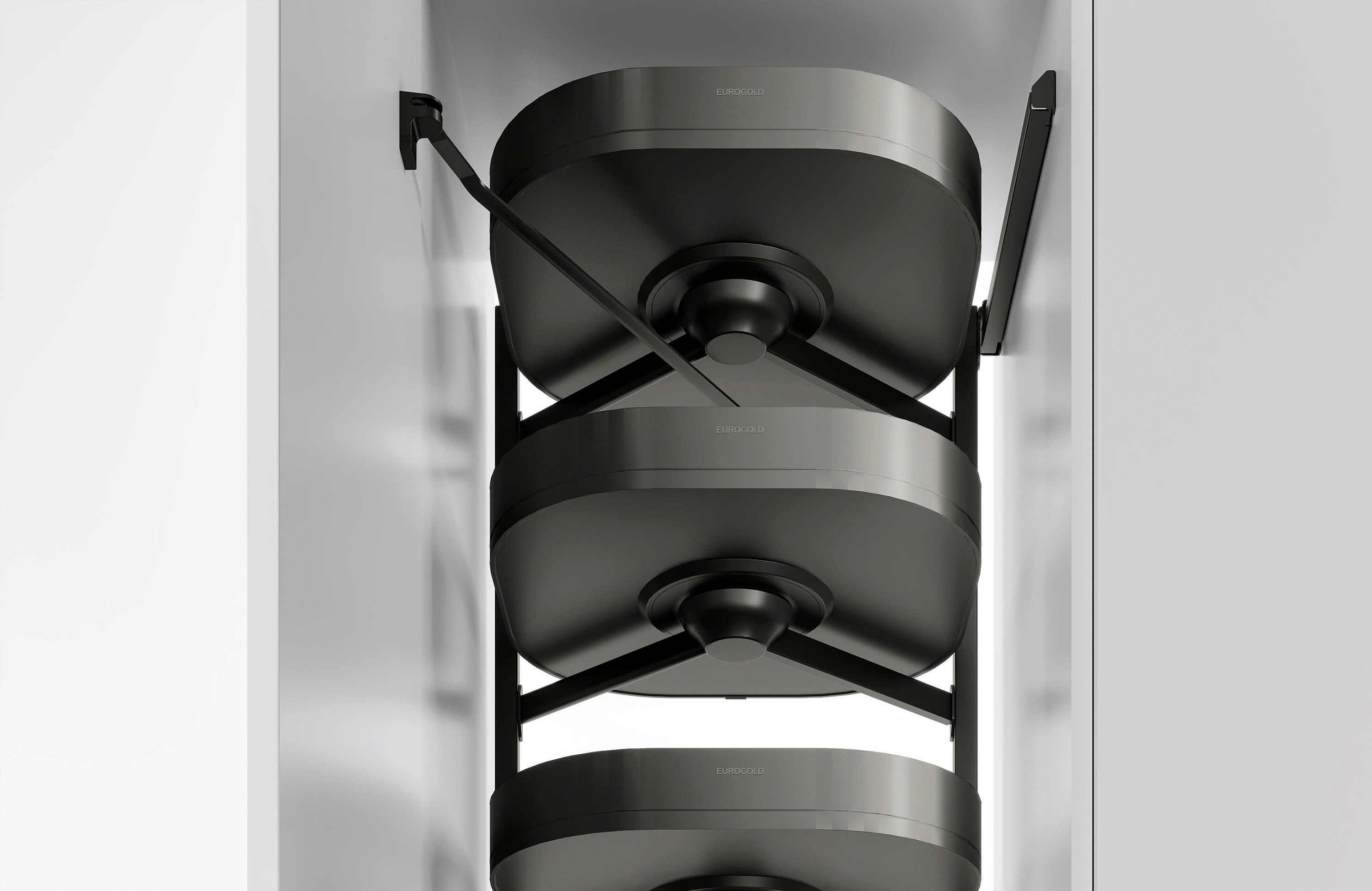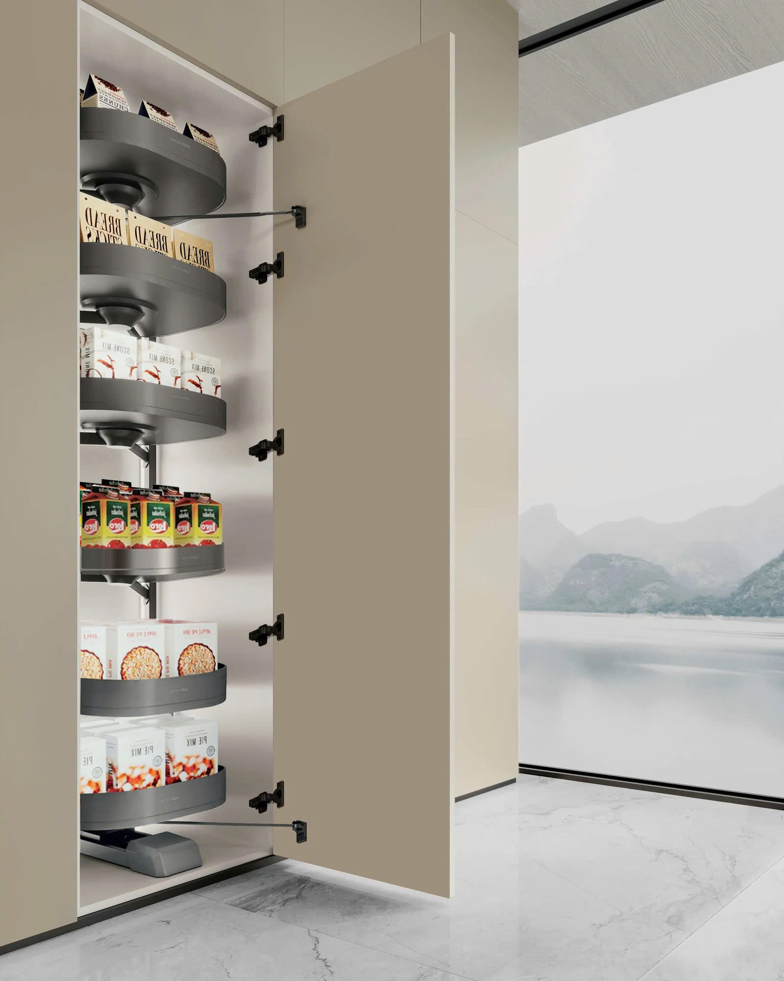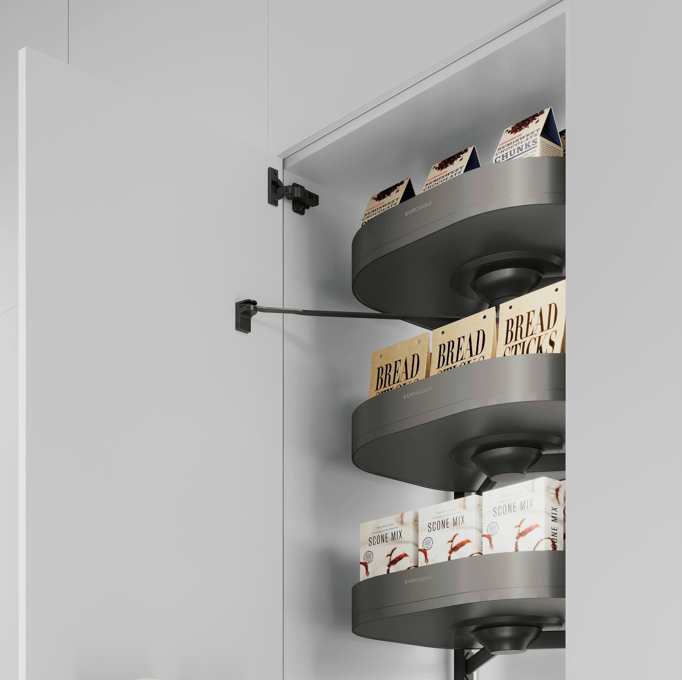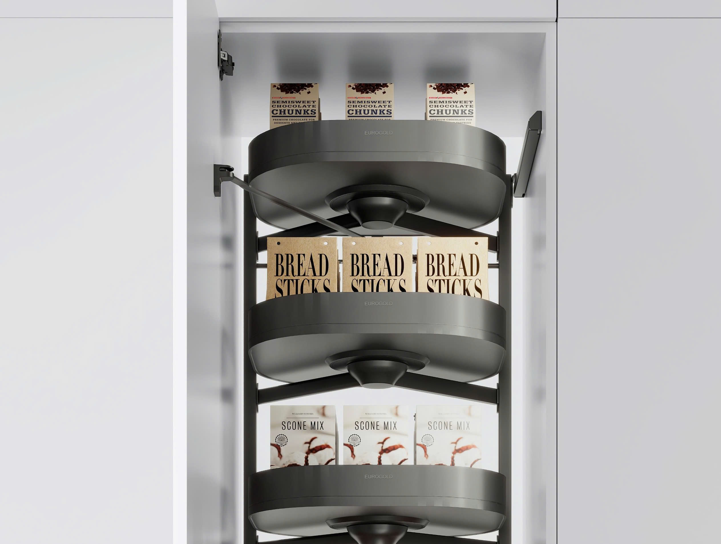 Với không gian lưu trữ lớn, tủ đồ khô 6 tầng xoay 360° hợp kim nhôm màu ghi đậm cánh mở 600mm Eurogold EUM6L60XG cung cấp các khay chứa có thể điều chỉnh linh hoạt cho mọi loại vật dụng nhà bếp, dễ dàng kéo các khay chứa ra chỉ bằng việc mở cánh tủ, giúp tiếp cận mọi ngóc ngách một cách thuận tiện. Chuyển động êm ái và khả năng chịu lực mạnh mẽ.