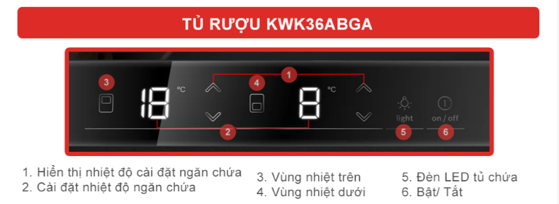 Bên trong khoang tủ rượu KWK36ABGA còn được trang bị thêm hệ thống đèn LED chiếu sáng. Đèn LED có thể mở ngay cả khi cửa tủ đóng lại, người dùng cũng có thể bật/ tắt tùy chỉnh. Và người dùng có thể dễ dàng cất hoặc xem để lấy những chai rượu mà mình yêu thích một cách dễ dàng.