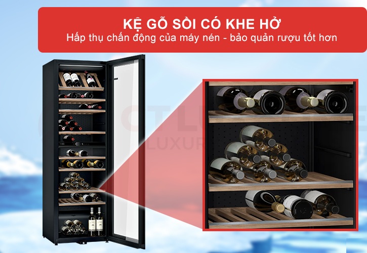 Bảo quản rượu tốt hơn với thiết kế kệ gỗ sồi có khe hở và làm mát bằng máy nén
